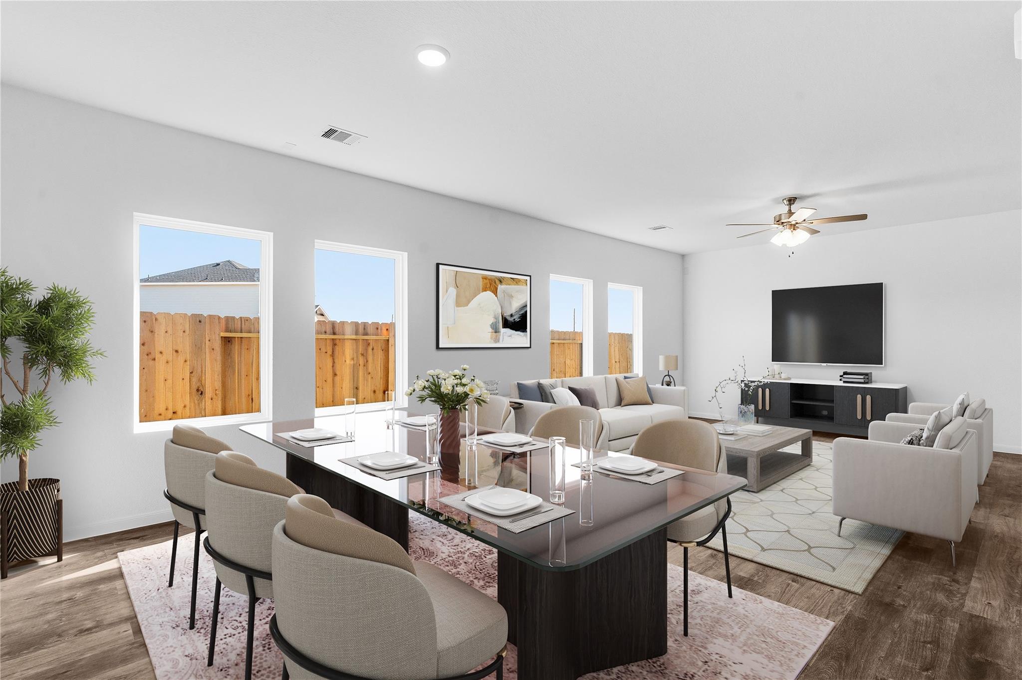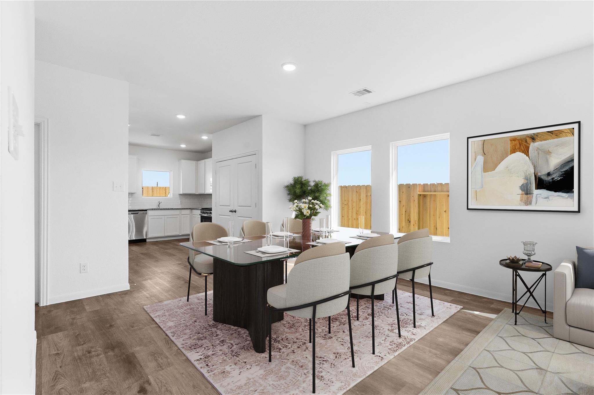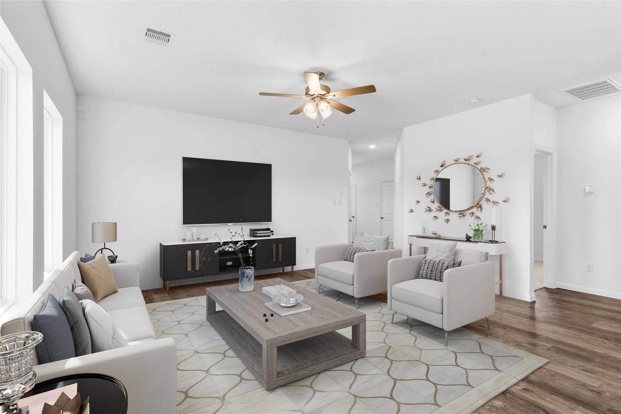 The Pecan Floor Plan by CastleRock Communities! This well-designed home offers 3 bedrooms and 2.5 baths with a beautiful brick elevation for timeless curb appeal. Step inside through a mahogany front door into a bright interior where vinyl plank wood flooring flows throughout an open-concept layout with high ceilings. The gourmet kitchen features granite countertops, chic tile backsplash, 42-inch shaker cabinets, deep undermount sink, an upgraded faucet, and stainless-steel gas appliances. The private primary suite provides a relaxing retreat with dual vanities, a massive shower, and a walk-in closet. Two secondary bedrooms share a full bath with a tub and shower combination, along with a convenient half bath for guests. Enjoy outdoor living on the covered patio, with blinds on all windows for added comfort. Energy Star Certified with a tankless on-demand water heater. Located in the beautiful Sweetgrass Village community with parks, a clubhouse, pickleball courts, and a swimming pool.